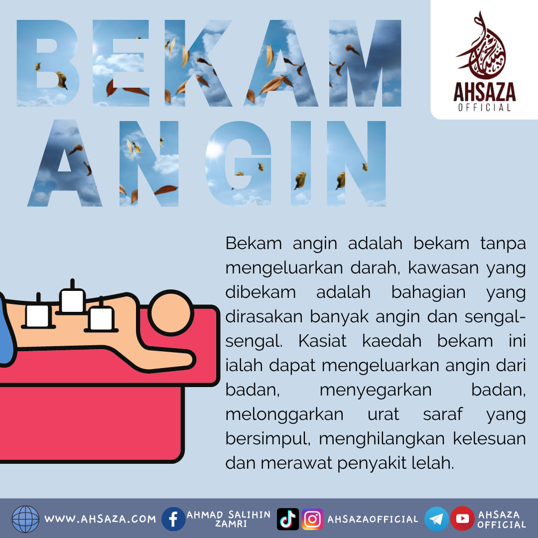 AHSAZA OFFICIAL menyediakan khidmat bekam dan mempunyai pembekam yang bertauliah dan pengiktirafan SKM3 dan ke atas. Bekam adalah teknik perubatan dengan kaedah mengeluarkan/membuang angin & darah kotor (sel darah merah yang rosak) dari dalam tubuh seseorang melalui permukaan kulit dengan sedutan cup bekam & seterusnya sayatan/torehan pisau bekam @ tusukan jarum pen bekam ke atas titik-titik bekam tertentu.