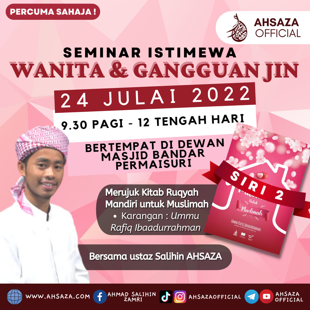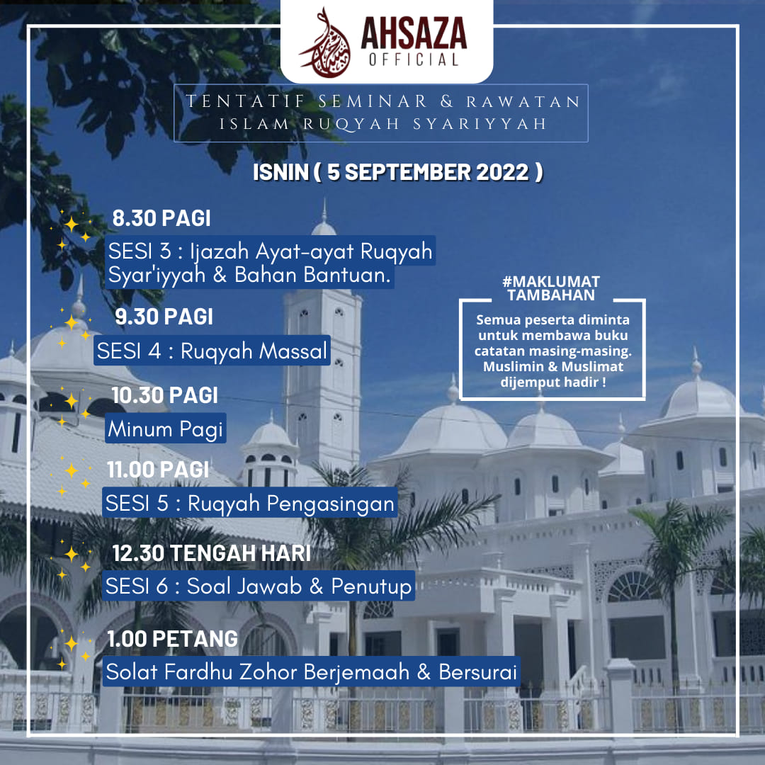 AHSAZA Official menyediakan seminar dan menerima jemputan untuk ceramah dan sebagainya secara percuma. Kami bercita-cita untuk melawat ke semua negeri pada tahun ini dengan harapan untuk membantu para pesakit yang masih belum sembuh, seterusnya berkongsi tentang ILMU Perubatan Islam Ruqyah Syar'iyyah yang sebenar mengikut garis panduan Syariat serta sama-sama membimbing masyarakat ke arah kebaikan. InsyaAllah !